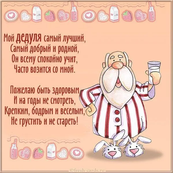Деда, с днем рождения! Желаю здоровья, удачи и чтобы никто не трогал твои «заначки», не отбирал пульт от телевизора и всегда был «за» помочь на даче.