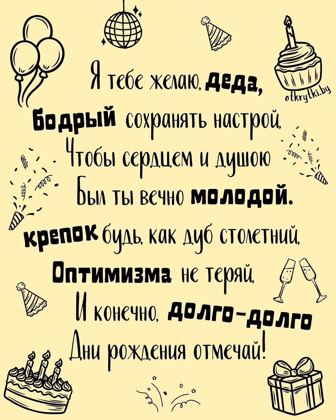 Дедушка, с днем рождения! Пусть суставы не скрипят, настроение всегда будет на высоте, бабушка радует вкусными пирогами, а внуки чаще заходят в гости (мы постараемся, честное слово!).